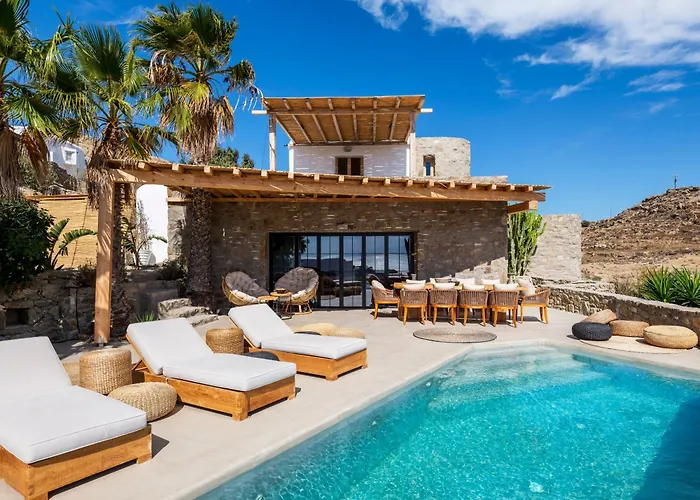 Located within a 10-minute drive of Lena's House Museum, the 5-bedroom Pure Mykonos Villa offers a terrace with views of the sea. Offering an infinity pool, the accommodation invites guests to visit Mykonos Vioma Organic Farm, located around 7 km away.